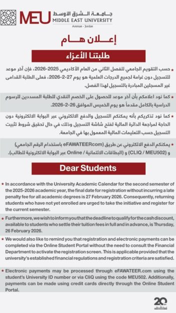 عمّان – قدمت كلية الصيدلة في جامعة الشرق الأوسط، محاضرة بعنوان: “السلامة العامة في المختبرات وآلية التعامل مع حوادث المواد الخطرة”، في رحاب الجامعة الأردنية، كأحد استراتيجيات الجامعة المعنية بإتاحة المناخ الإبداعي لأعضاء الهيئة التدريسية فيها.