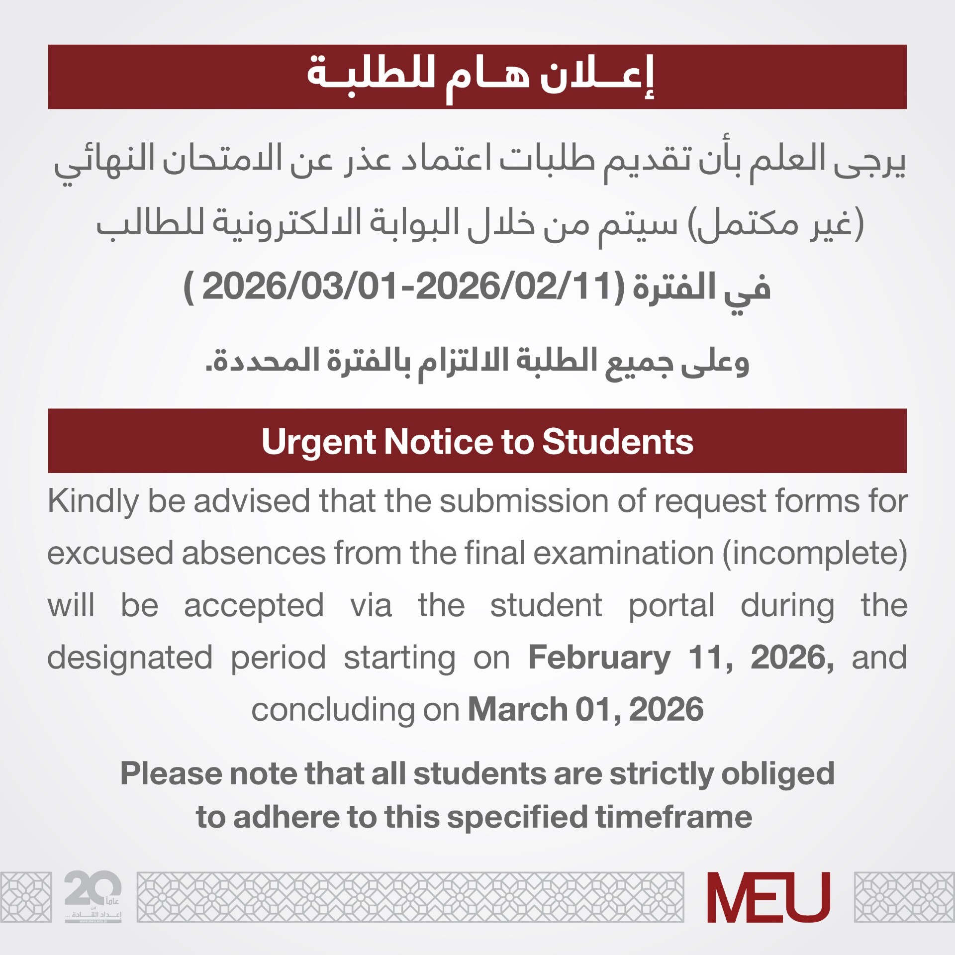 اعلان هام للطلبة