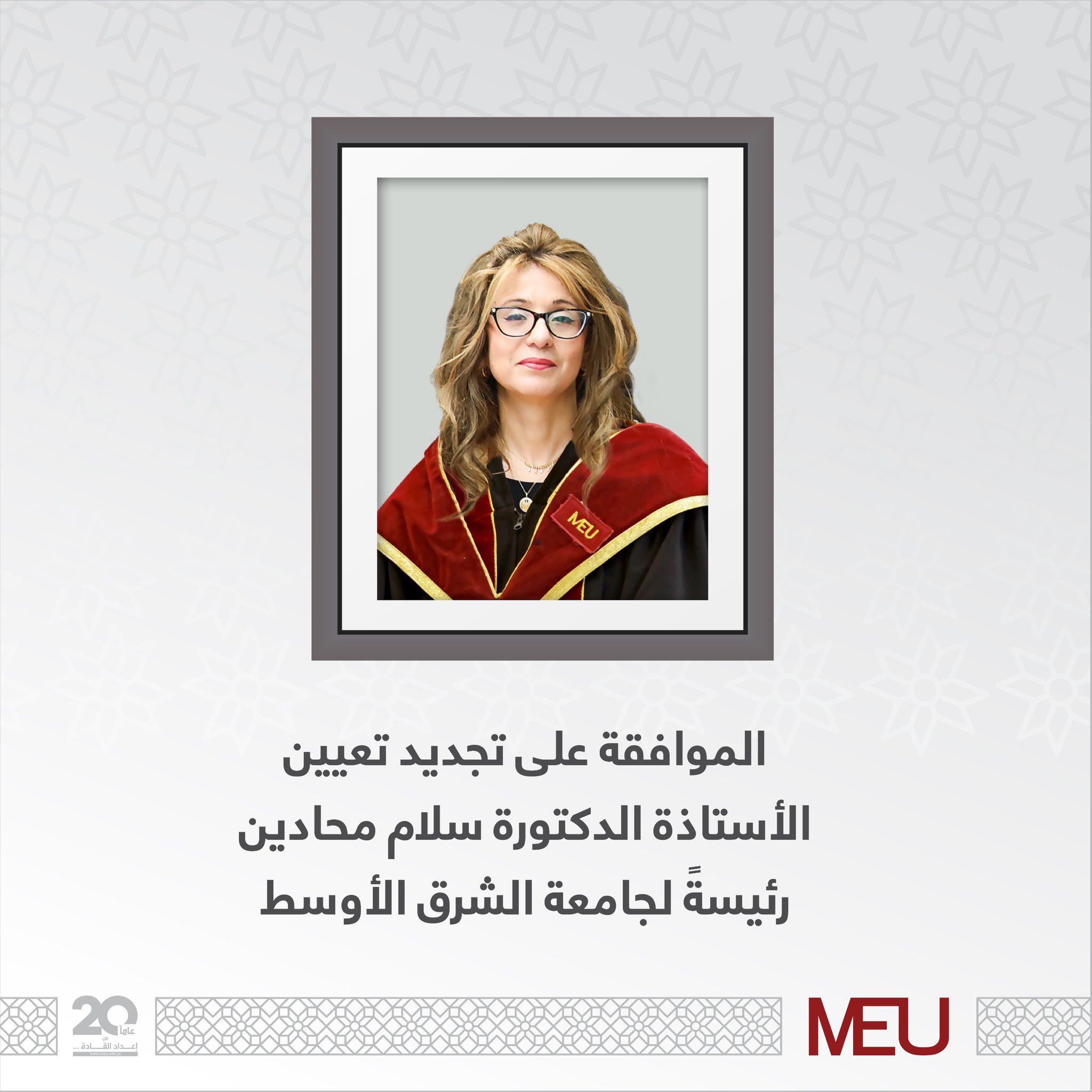 جَدَّد مجلسُ أمناء جامعة الشرق الأوسط ثقتهُ بالأستاذة الدكتورة سلام خالد محادين، مقرّرًا تمديد فترة تعيينها رئيسةً للجامعة لمدة أربع سنوات جديدة.