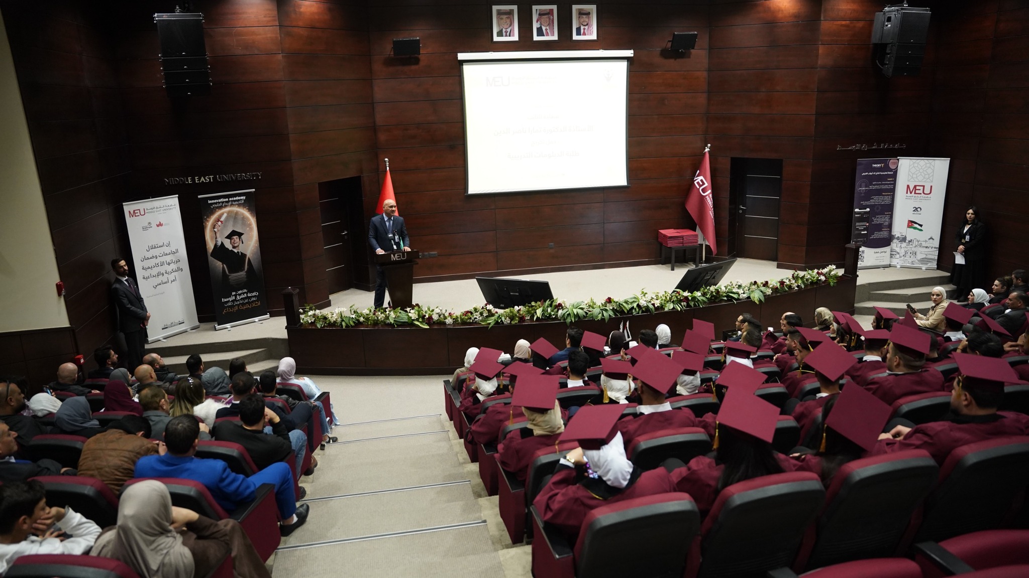 رعى حفل التخريج النائب الأستاذة الدكتورة تمارا ناصر الدين، بحضور مدير مركز الابتكار والتطوير المهني الأستاذ الدكتور أنيس المنصور، وعمداء الكليات، وممثلي الأكاديميات، وجمع من الطلبة.