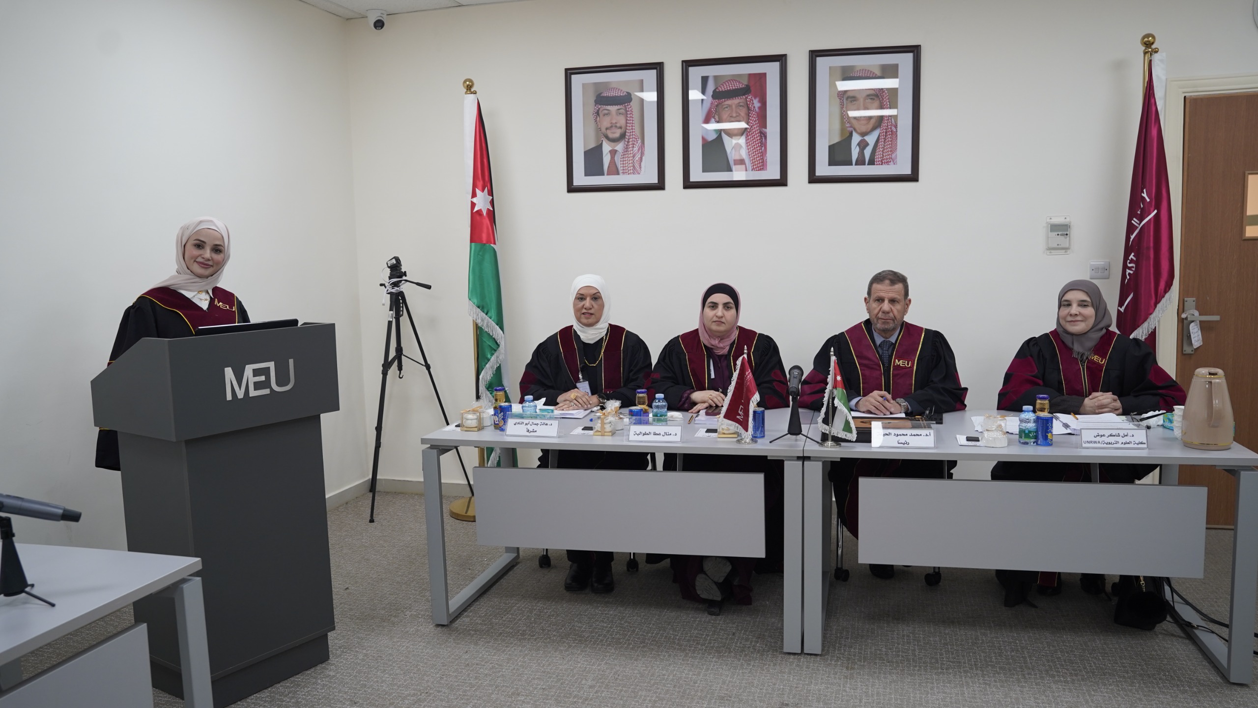 وتشكلت لجنة المناقشة من الأستاذ الدكتور محمد الحيلة عضوًا ورئيسًا، والدكتورة منال الطوالبة عضوًا، والدكتور أنس بني عطا مراقب الجلسة، والدكتورة أمل عوض عضوًا من خارج الجامعة / كلية العلوم التربوية والآداب (UNRWA).