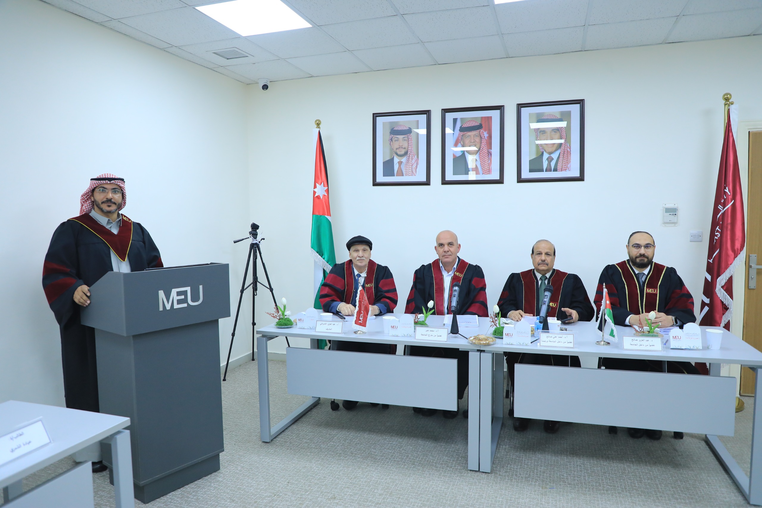 وتشكلت لجنة المناقشة من الأستاذ الدكتور أحمد صالح عضوًا ورئيسًا، والأستاذ الدكتور عبد العزيز الشرباتي مشرفًا، والدكتور عبد العزيز محمد عضوًا، والأستاذ الدكتور محمد خير سليم أبو زيد عضوًا من خارج الجامعة (جامعة البلقاء التطبيقية).