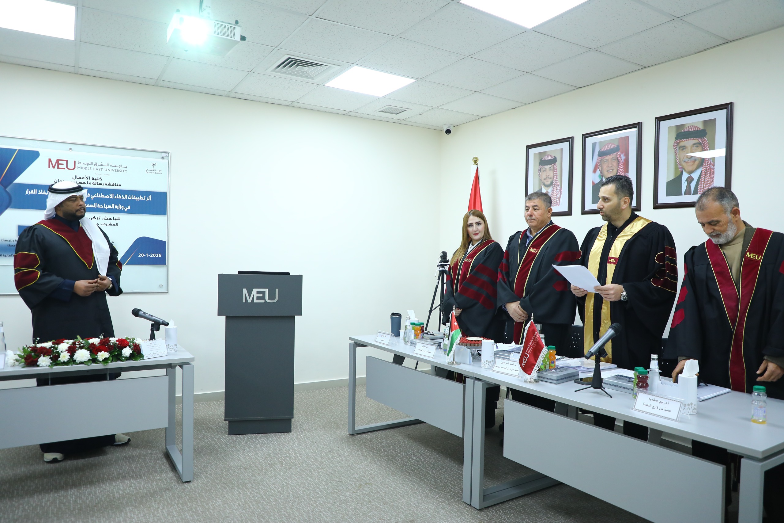 وتشكلت لجنة المناقشة من الدكتور أحمد ناصر الدين عضوًا ورئيسًا، والدكتورة دينا الخضري مشرفًا، والدكتور مراد عطياني، والأستاذ الدكتور لؤي محمد صالحية عضوًا من خارج الجامعة (الجامعة الألمانية الأردنية).