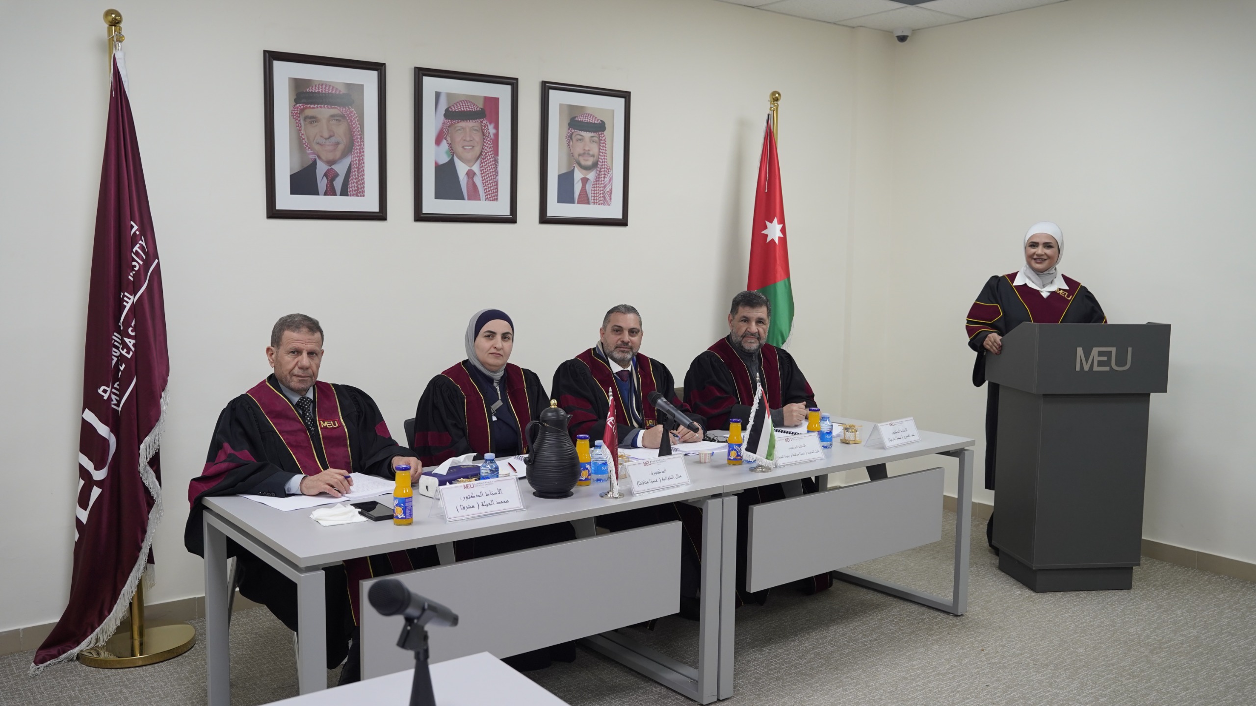 وتشكلت لجنة المناقشة من الأستاذ الدكتور خليل السعيد عضوًا ورئيسًا، والأستاذ الدكتور محمد الحيلة مشرفًا، والدكتورة منال الطوالبه عضوًا، والأستاذ الدكتور عمر حسين العمري عضوًا من خارج الجامعة (جامعة مؤتة).