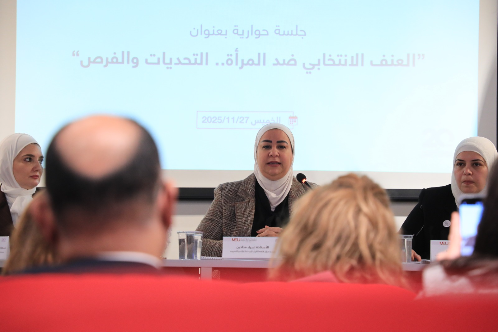 In her speech, Prof. Tamara Nasereddin presented an in-depth analysis of one of the most prominent challenges facing women in their political careers, namely cyber violence, which began before the launch of her election campaign and continued thereafter, taking various forms from digital bullying to organised attacks aimed at influencing public opinion and undermining women’s presence in the political arena.