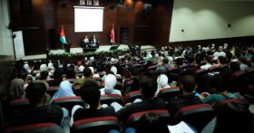 Al-Shaboul speaks to the students of the Faculty of Media at Middle East University on the need for media awareness and the need to prioritise national interest over individualism.